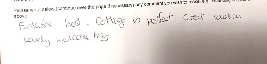 We’ve enjoyed staying at Burnbrae very much and we were delighted that one of the cottages (Begrum) allows dogs. Thankyou for the ‘welcome’ tray of afternoon tea – the scones and jam were delicious – a lovely touch. The cottage is well designed to give plenty of ‘practical’ space i.e. for coats/ boots et. Its such a comfortable feel – so relaxing to sit in the conservatory and have breakfast looking out to the garden and fields. It’s even so cosy that we didn’t even light the log burner – even although we love them!