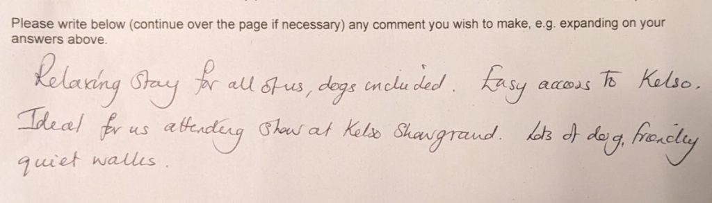 We’ve enjoyed staying at Burnbrae very much and we were delighted that one of the cottages (Begrum) allows dogs. Thankyou for the ‘welcome’ tray of afternoon tea – the scones and jam were delicious – a lovely touch. The cottage is well designed to give plenty of ‘practical’ space i.e. for coats/ boots et. Its such a comfortable feel – so relaxing to sit in the conservatory and have breakfast looking out to the garden and fields. It’s even so cosy that we didn’t even light the log burner – even although we love them!